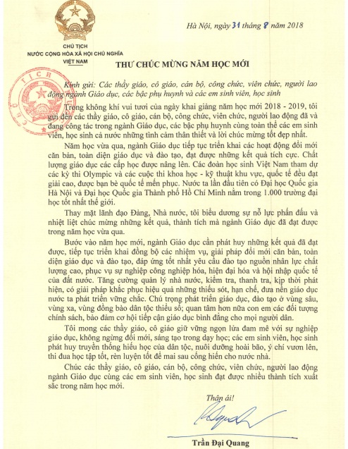 Nhân dịp khai giảng năm học 2018 – 2019, Chủ tịch nước Trần Đại Quang đã gửi Thư chúc mừng tới các thế hệ nhà giáo, cán bộ, công chức, viên chức, người lao động ngành Giáo dục, các bậc phụ huynh và các em sinh viên, học sinh cả nước.